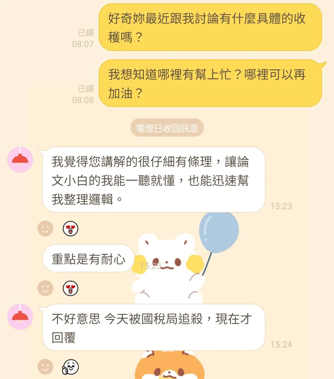我覺得有比較回到能投入做研究的心態(會覺得有意義、有方向)之前忘記在哪看到一本論文的書說寫論文最痛苦的是「想努力但不知道從何下手」,我覺得過去很多時候都很迷茫,所以慶幸有上軌道!也謝謝你可以從很多面向討論,還有論文真的是訓練邏輯跟自己下決定,持續磨練中。
