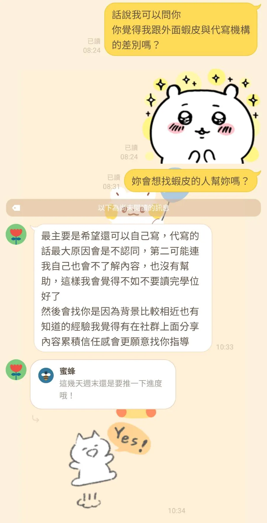 最主要是希望還可以自己寫,代寫的話,最大原因會是不認同,第二可能連我自己也會不了解內容,也沒有幫 助,這樣我會覺得不如不要讀完學位好了。然後會找你是因為背景比較相近也有知道的經驗我覺得有在社群上面分享,內容累積信任感會更願意找你指導。